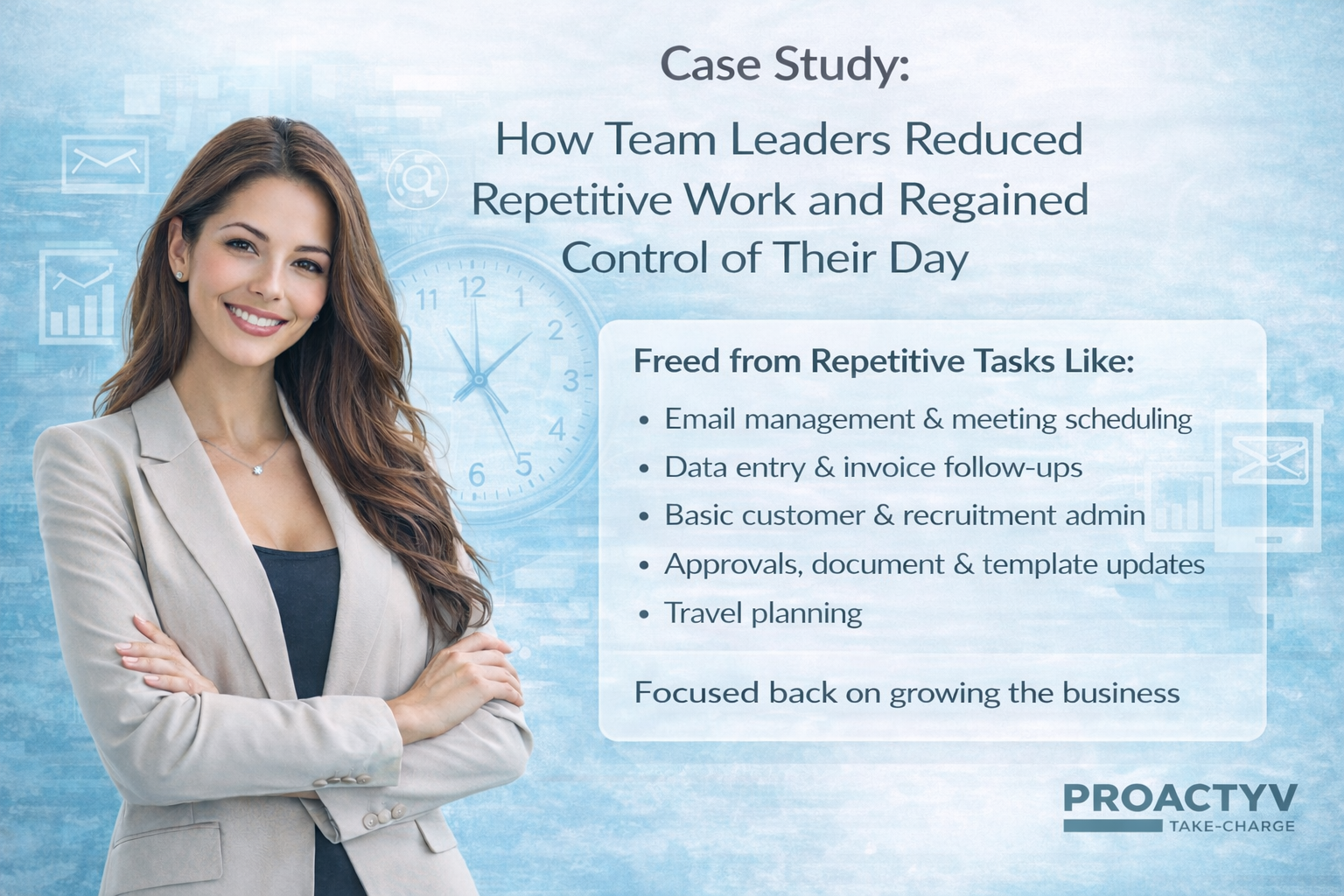 Proactyv supports team leaders by taking ownership of repetitive operational work, so leadership stays focused where it matters most.